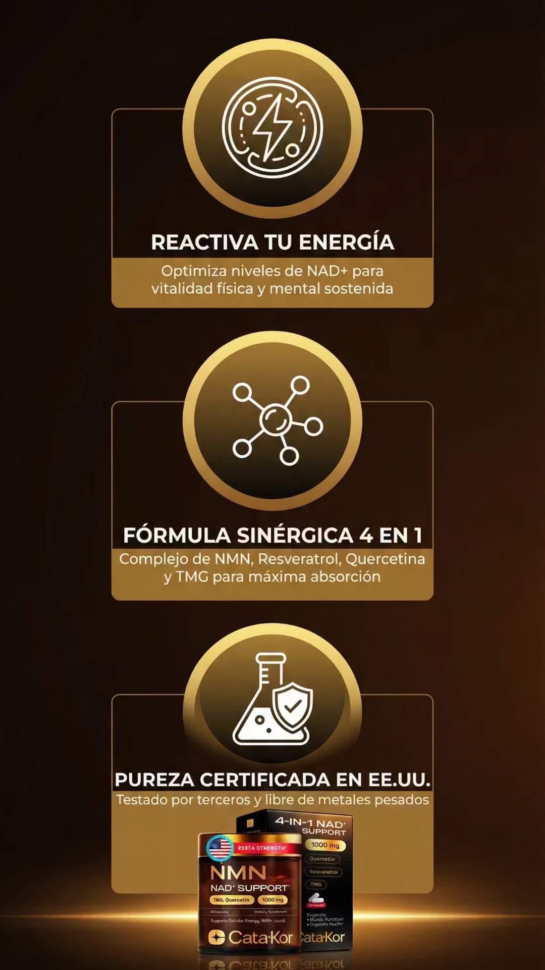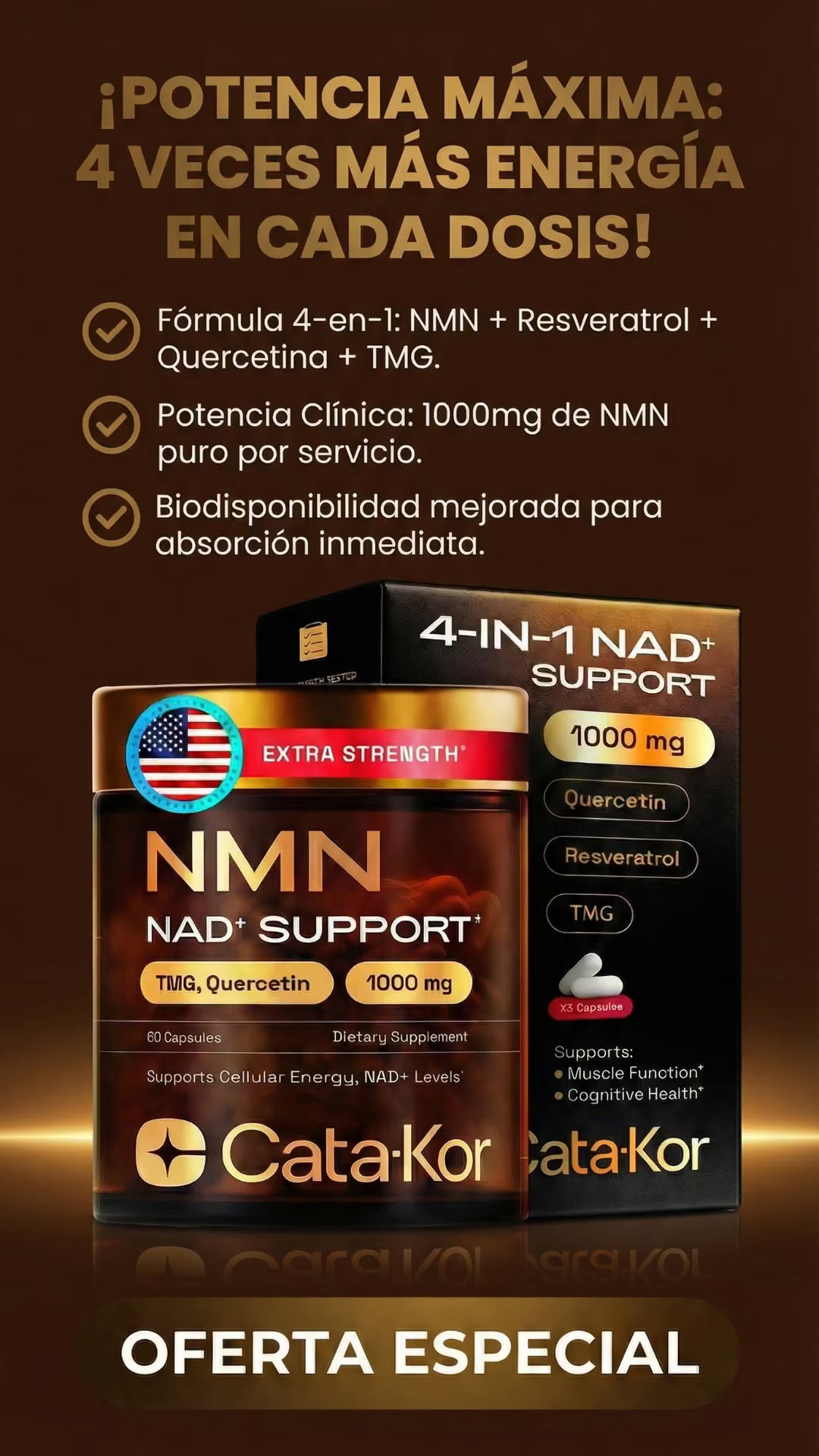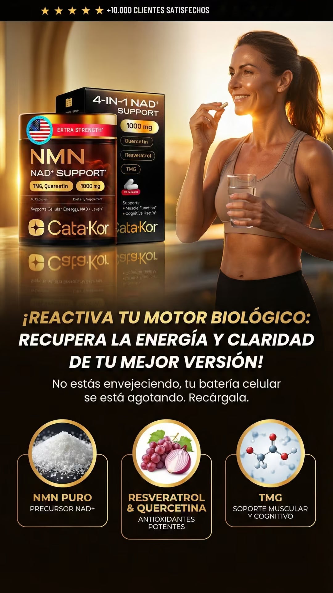 Complejo avanzado de NMN, Resveratrol y Quercetina que reactiva la energía celular (NAD+) y combate el envejecimiento. Diseñado para potenciar tu vitalidad física y claridad mental. Toma 2 cápsulas diarias por la mañana. Fórmula segura, vegana y certificada en EE.UU. para una longevidad activa y un metabolismo eficiente.