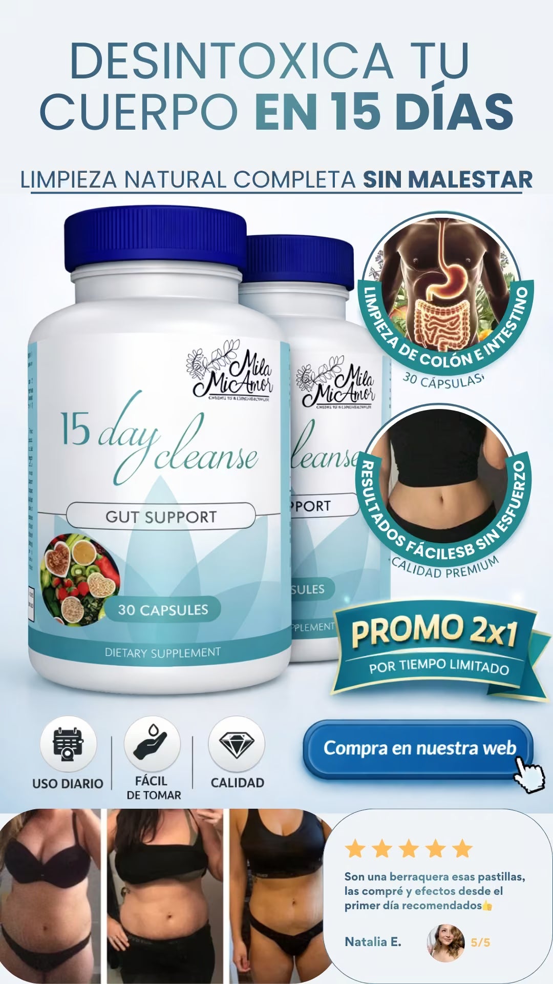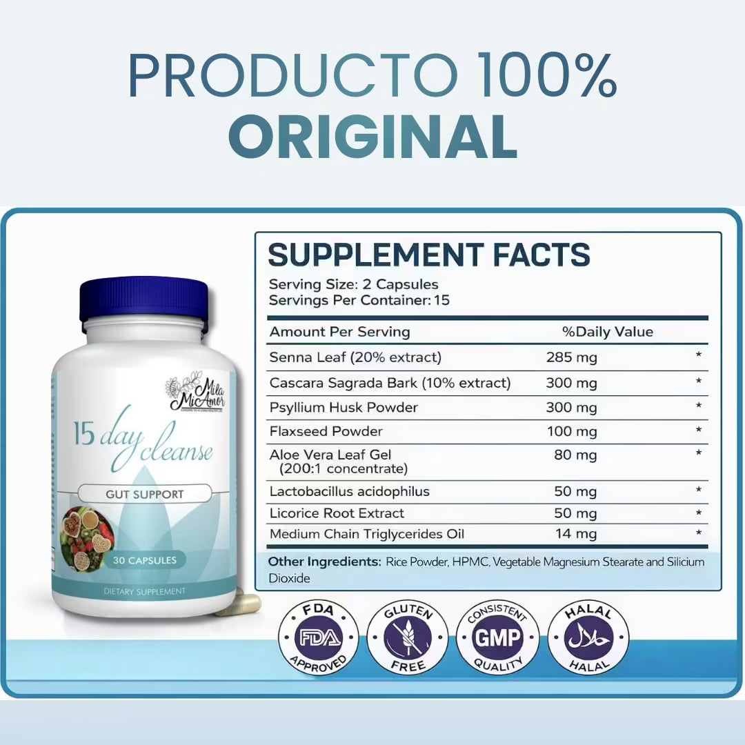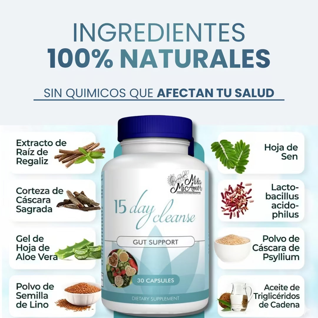 15 Day Cleanse es un suplemento natural en cápsulas diseñado para apoyar la rutina digestiva y el bienestar diario. Acompaña los procesos naturales de eliminación del cuerpo, ayudando a sentirte más ligero y cómodo. Ideal para una rutina de 15 días, con uso práctico y fácil de incorporar cada mañana.