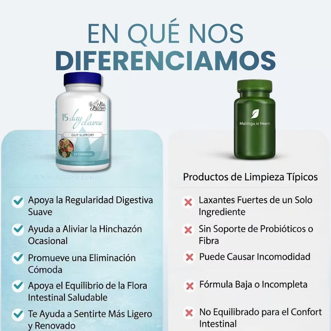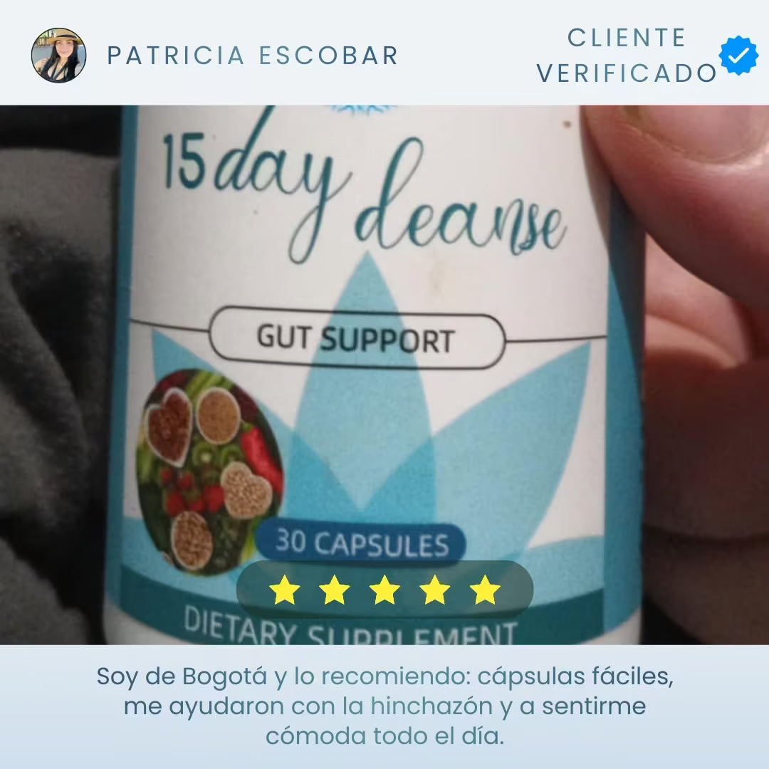 Conoce cómo 15 Day Cleanse acompaña rutina digestiva, ayuda a sentirte más ligera, baja sensación de pesadez y apoya bienestar general real en 15 días.