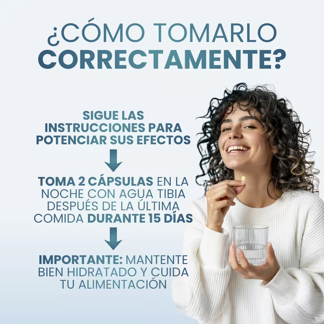 Es un suplemento en cápsulas diseñado para acompañar tu rutina digestiva diaria durante 15 días.