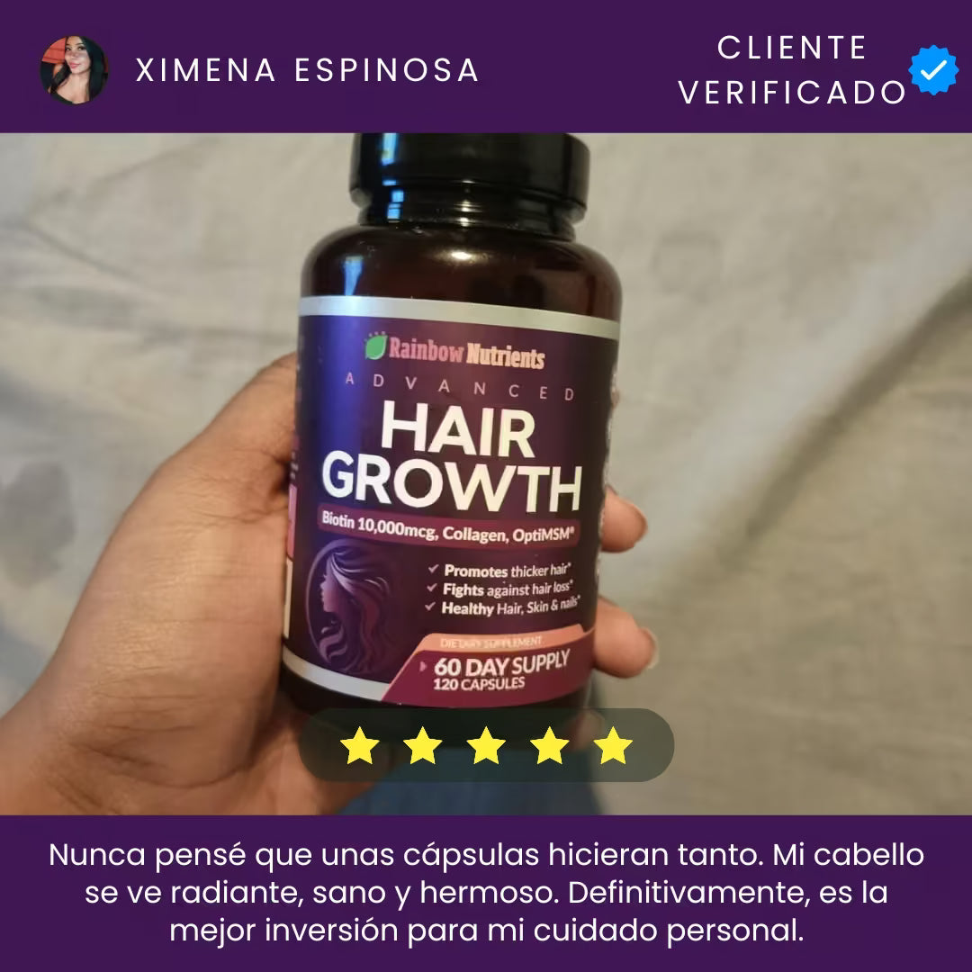 Rainbow Nutrients Hair Growth es un suplemento premium Non-GMO fabricado en EE. UU., diseñado para mujeres. Con 10,000 mcg de biotina y colágeno, combate la caída, fortalece uñas y mejora la piel. Incluye suministro para 2 meses y garantía de devolución de 60 días. ¡Nutrición total sin riesgos!